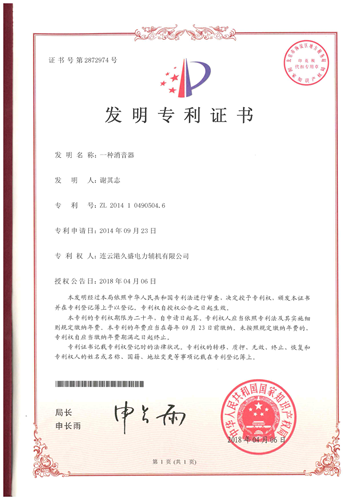 近日,协会会长单位“连云港久盛电力辅机有限公司”自主开发的“一种消音器”技术获得国家知识产权局颁发的发明专利证书(证书编号:ZL201410490504.6)。该专利是久盛公司继“核电机组消音器”、“烟气收能消音器”、“吸热位移型消音器”、“新型高效吹管消音器”及“多级复合式消音器”后的消音器类产品第七个获得专利证书的技术,也是该公司首个消音器类别产品获得发明专利证书。