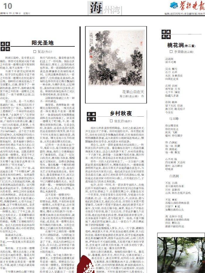 11月21日,是“连云港市电力辅机行业协会”成立十周年的重要日子。为感谢国内外电力辅机用户及我市200余家电力辅机公司对本协会长期以来的大力支持,江苏省作家协会成员、本协会副秘书长李秉建接受协会邀请,历时一个月独立创作“桃花涧”‘“白鸽涧”、“马耳峰”等三首纪念组诗,并在连云港“苍梧晚报”及电力辅机协会网站公开发表。